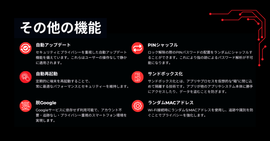 既存のOSを根本から見直し、データの暗号化、通信の匿名化、物理ハッキングへの耐性を極限まで高めました。